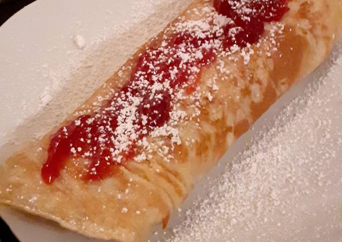 - Zum Schluss das Vanilleeis auf den Pfannkuchen geben und einschlagen. Die Erdbeerkonfitüre oben drüber streichen und mit Puderzucker bestreuen..