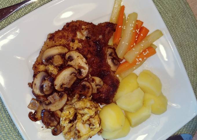 Ein paniertes Kotelett mit leicht scharfen Ingwer-Honig-Gemüse Schritt für Schritt Anleitung