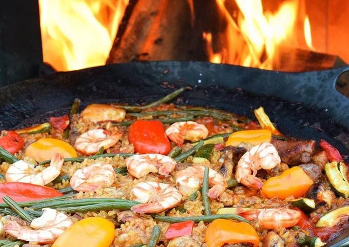 Paella 🥘. 🥘 Best traditional Spanish paella recipe. As we said, here we are going to learn how to cook the original recipe. A flat, shallow, black pan with side handles, containing saffron-colored rice, vegetables, a leg of poultry, and/or shrimp and lemon slices.