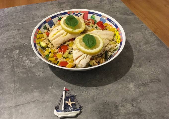 - Das zitronige Öl aus der Fischpfanne kann gerne über den Reis gegeben werden. Nun alles nach Belieben anrichten, gerne noch mit Basilikum und etwas mehr Zitrone 🍋 zum abschmecken..