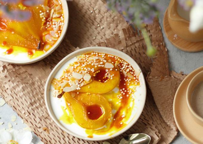 - Joghurt in Schälchen anrichten, die Birnen drauflegen. Den Sud ohne Gewürze sirupartig einköcheln lassen und über die Birnen träufeln. Sofort servieren. Gutes Gelingen!!.